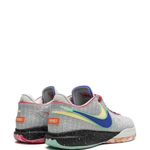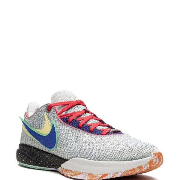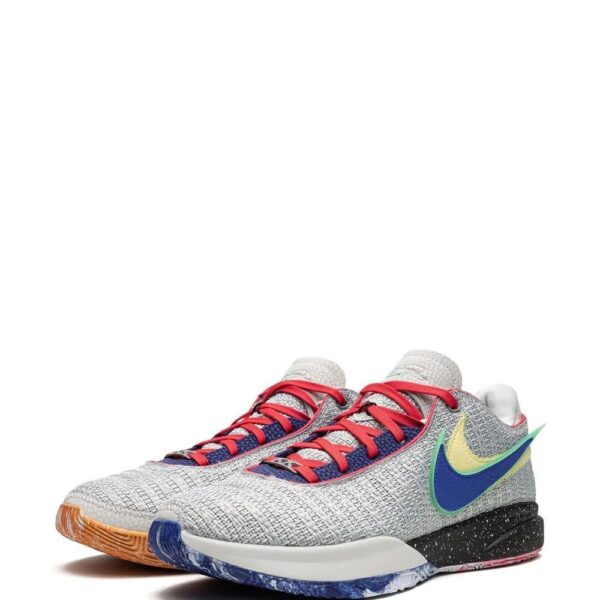 The LeBron 20 “Nike Lifer” sneakers feature a multicoloured design in yellow, blue, orange, and red tones. They’re constructed with a light grey knit upper and sit atop a contrasting rubber sole for comfort and traction.