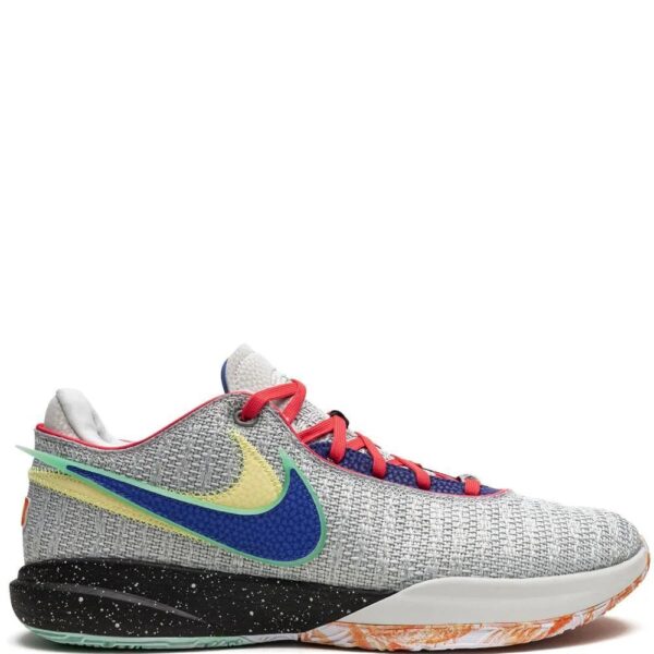 The LeBron 20 “Nike Lifer” sneakers feature a multicoloured design in yellow, blue, orange, and red tones. They’re constructed with a light grey knit upper and sit atop a contrasting rubber sole for comfort and traction.