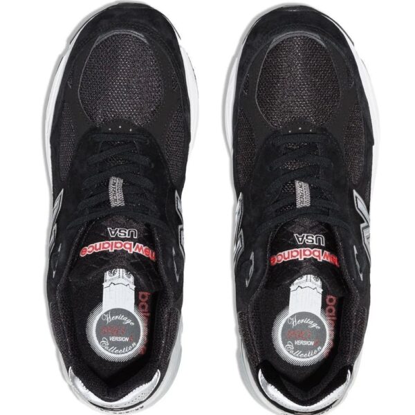 Made In USA 990 low-top sneakers from NEW BALANCE featuring black, suede, logo patch to the side, logo patch at the tongue, mesh detailing, round toe, front lace-up fastening, branded insole and flat rubber sole.