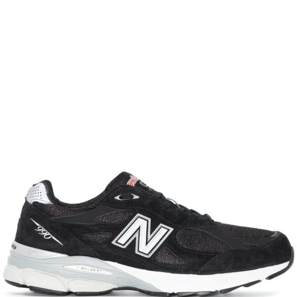 Made In USA 990 low-top sneakers from NEW BALANCE featuring black, suede, logo patch to the side, logo patch at the tongue, mesh detailing, round toe, front lace-up fastening, branded insole and flat rubber sole.